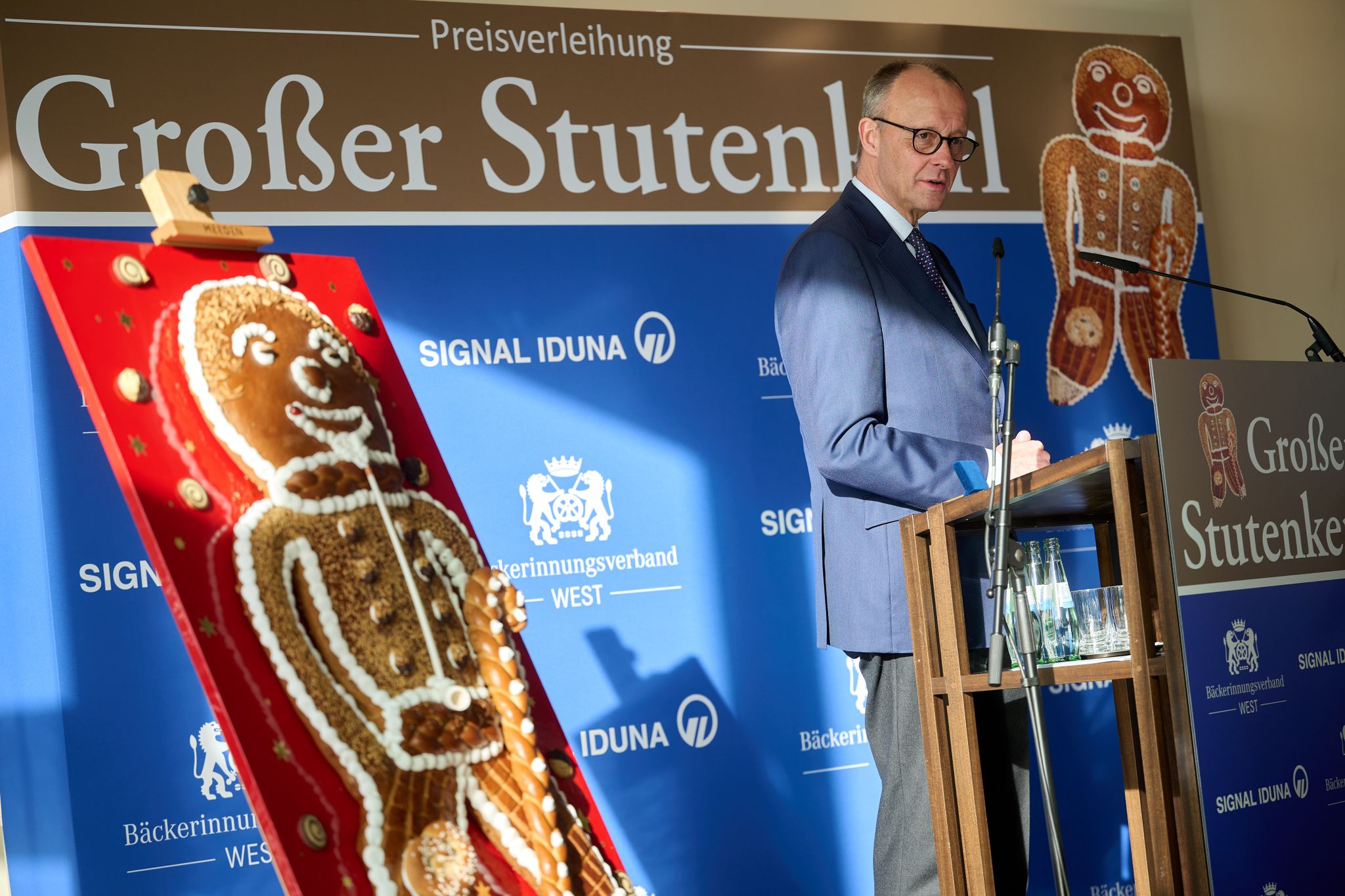 Der Kanzler sieht das Land vor großen Aufgaben, aber hält nichts von Pessimismus. In Dortmund bekommt er eine besondere Auszeichnung der Bäckerinnung. Ein Promi aus der Fußballwelt sagt, warum.